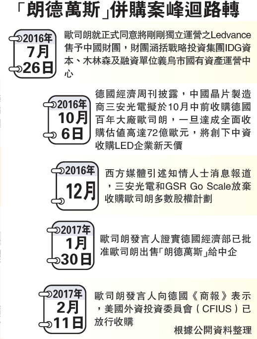 德國經濟部在宣布重審愛思強併購案時,曾稱將進一步深入調查中企對歐司朗收購計劃。到今年1月30日,歐司朗發言人證實德國經濟部已批準歐司朗出售“朗德萬斯”給中企。本月11日,歐司朗發言人向德國《商報》表示美國外資投資委員會(CFIUS)也已放行此項收購。分析認為,理論上只需中國監管部門批準,中資財團即可如期于2017財年完成對歐司朗照明業務的收購。