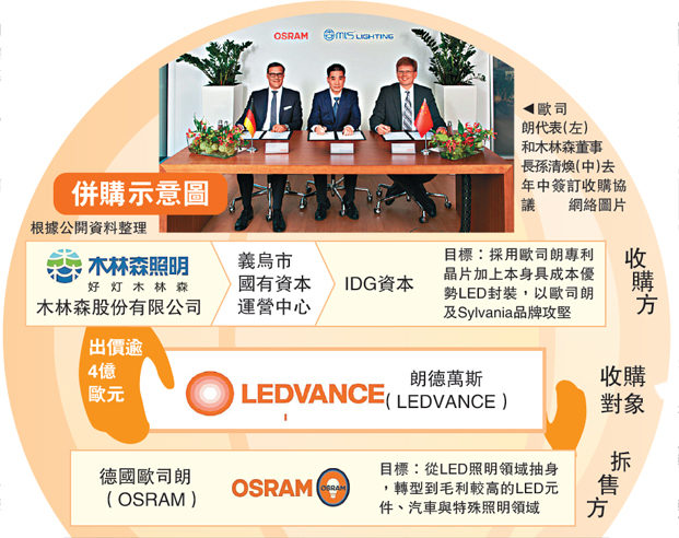 圖:歐司朗代表(左)和木林森董事長孫清煥(中)去年中簽訂收購協議