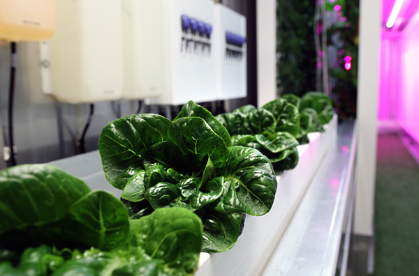 如果你走進集裝箱,能立馬看到布滿了紅藍光LED組合光,而控制這種光就能更有效地控制產物。通過控制植物的各項生長條件,集裝箱農場一年四季都能種植和收割。